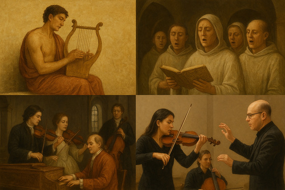 De westerse muziek kent een geschiedenis van ruim 2500 jaar, waarin zij zich ontwikkelde van een eenvoudig klankmiddel tot een complex en veelzijdig expressiemiddel. In de Grieks-Romeinse oudheid speelde muziek een belangrijke rol in religie, filosofie en onderwijs. De Grieken zagen muziek als een afspiegeling van kosmische orde — Pythagoras legde de basis voor de toonleer en Plato beschouwde muziek als opvoedkundig instrument. De Romeinen namen veel van deze ideeën over, maar hechtten meer belang aan muziek als vermaak, vooral in publieke spektakels.
